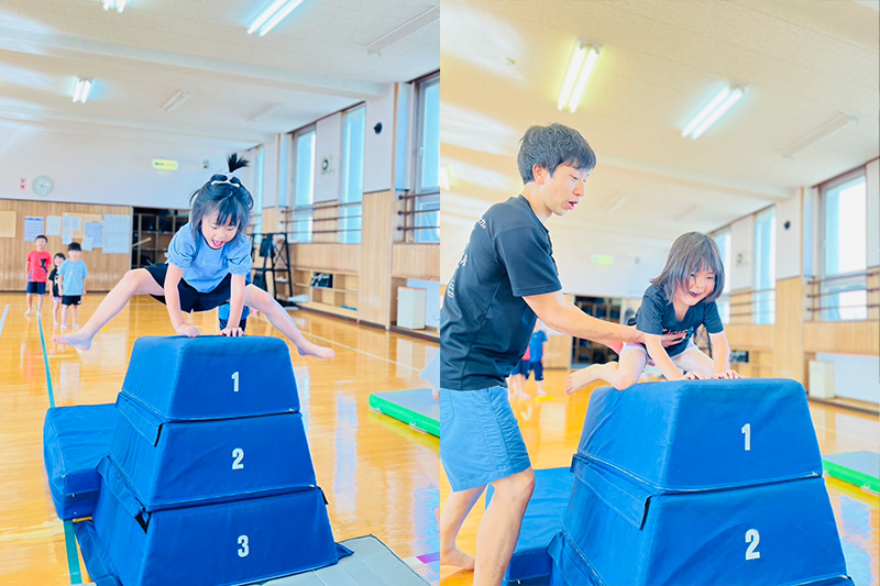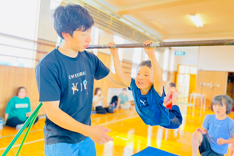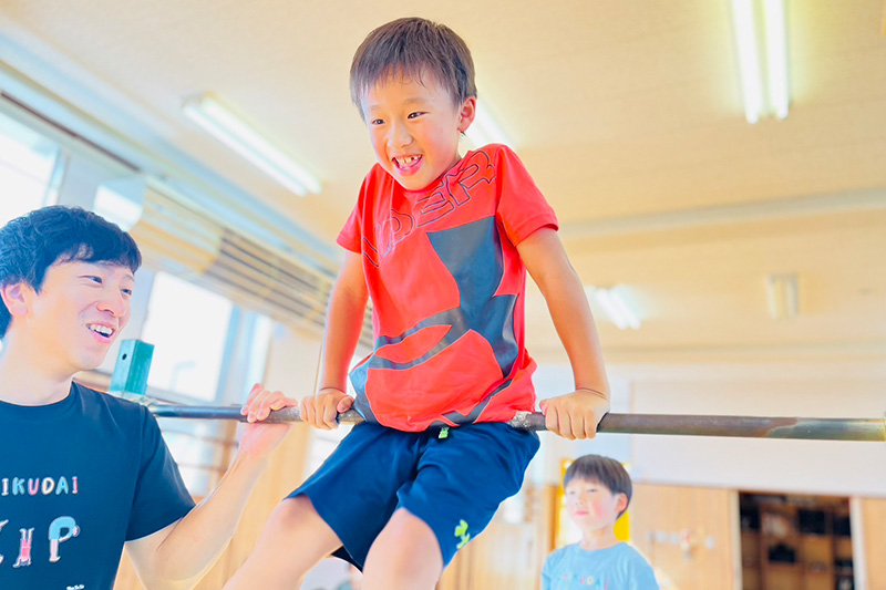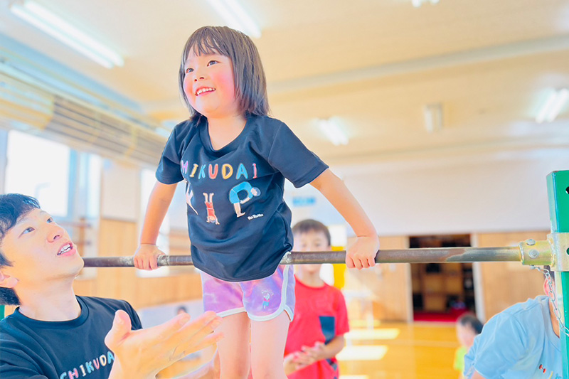 園児〜小学生の、運動がとても苦手な子や発達に不安のある子を対象とします。教室では自由度を高く設定し、それぞれが体操遊びの中から自分で楽しさを発見できる環境をつくっています。自己決定で積み重ねられた小さな自信を、いずれは大きな自己肯定感へと成長させることを狙っています。